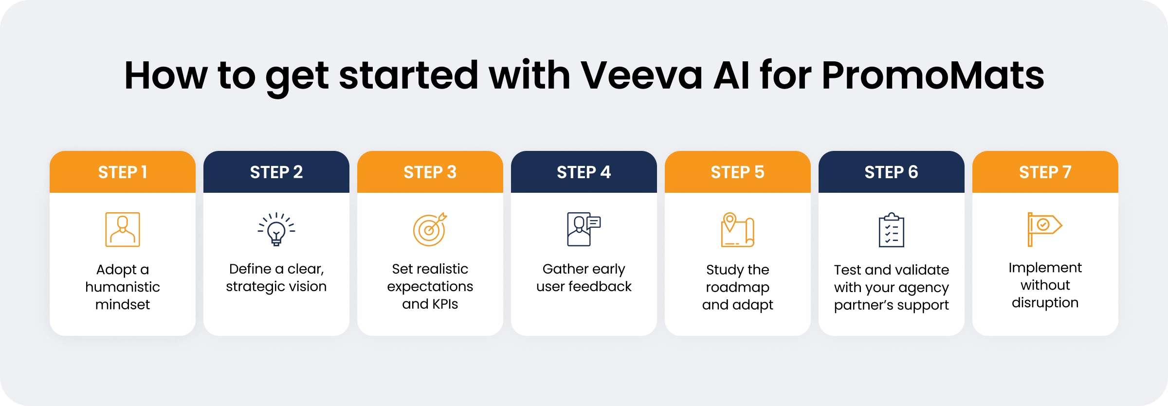Moderna’s MLR transformation project with Veeva AI for PromoMats provides a blueprint for other biopharmas embarking on their AI journey. Here is a seven-step guide based on the company’s insights and best practices: