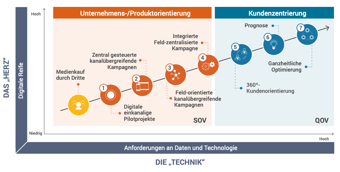 - Stufe 4 schafft eine Plattform für die Koordination von Vertrieb und Marketing: das Tor zu kundenorientierter Kommunikationsqualität (Quality of Voice – QOV)4 im Gegensatz zum Kommunikationsanteil (Share of Voice, SOV)5 (Stufe 5)
