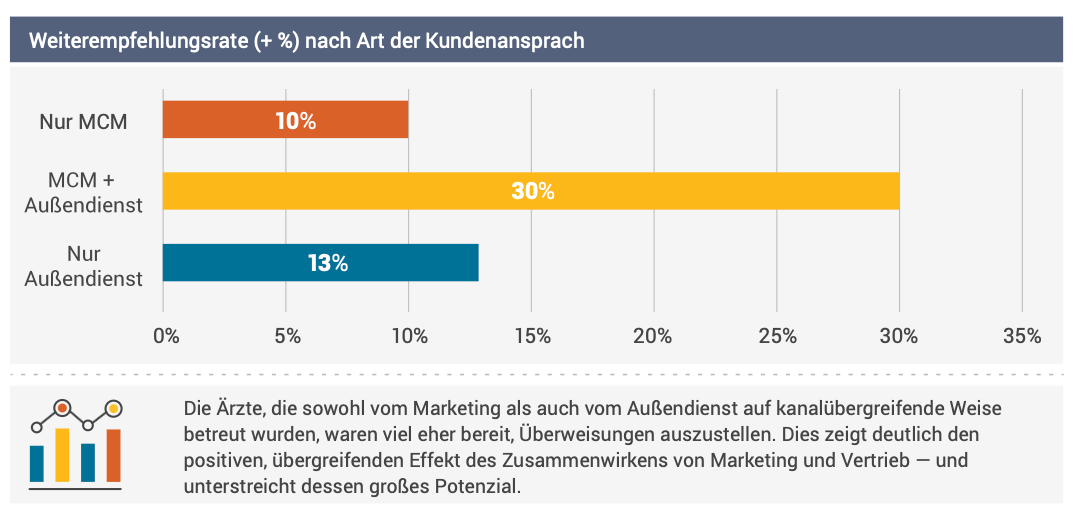 Die Ärzte, die sowohl vom Marketing als auch vom Außendienst auf kanalübergreifende Weise betreut wurden, waren viel eher bereit, Überweisungen auszustellen. Dies zeigt deutlich den positiven, übergreifenden Effekt des Zusammenwirkens von Marketing und Vertrieb — und unterstreicht dessen großes Potenzial. Der Ansatz, ein großartiges Beispiel für das sogenannte Hyper Targeting, ist ein klares Zeichen dafür, dass Marketing und Vertrieb besser zusammenarbeiten, wenn beide Rollen aufeinander abgestimmt und miteinander verbunden sind.