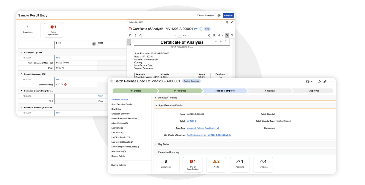 Manage the end-to-end QC batch disposition workflow, including digital sample results entry, trend analysis, review by exception, generation of the Certificate of Analysis (CoA) and publication of outcomes to Veeva Batch Release.