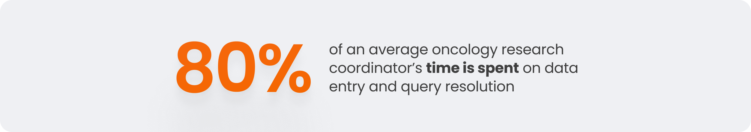 The senior director of clinical research informatics at a top oncology site in New York found that their average coordinator spends about 80% of their time on data entry and query resolution. This impacts site staff turnover. “Research coordinators do not get into this industry because they want to copy and paste data all day. They want to work with investigators, speak to patients, and learn the science,” says the executive.