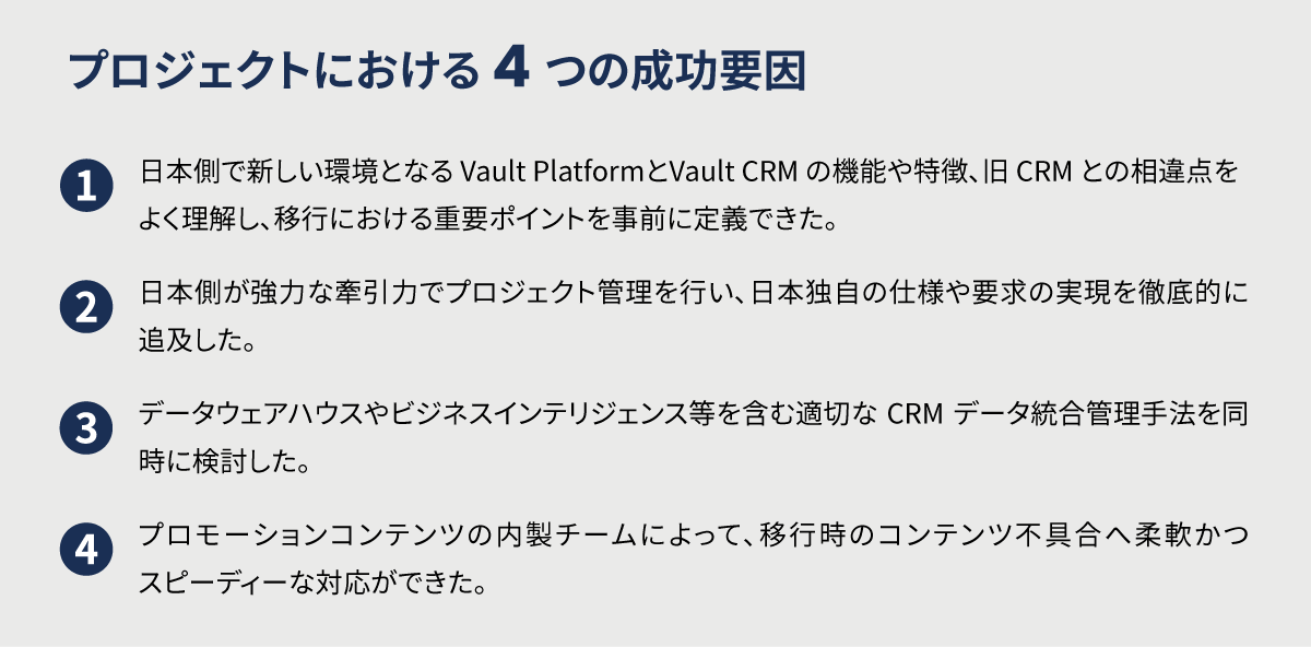 日本の情報提供のあり方やビジネス慣習等の背景から、グローバルのシステム標準ではなく日本独自でカスタマイズしている仕様・機能も複数あります。そうしたところへの配慮はグローバルプロジェクトでは享受しづらいものです。中島氏は次のように振り返っています。「日本固有の仕様・機能が損なわれることなく移行できたのは、日本のプロジェクトメンバーが事前検証の中でVault CRMへの理解と知識を深めることができたと同時に、Veeva Japanの強力かつきめ細やかなテクニカルサポートを受けられたことが大きな成功要因でした」