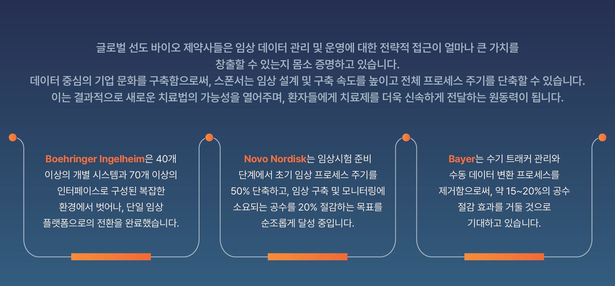 본 백서에서는 글로벌 Top 20 바이오 제약사인 Boehringer Ingelheim, Novo Nordisk, 그리고 Bayer의 최신 임상 혁신 사례를 다루며, 각 기업의 비즈니스 케이스, 운영 모델, 변화 관리 전략 및 실제 성과를 심층적으로 분석합니다.