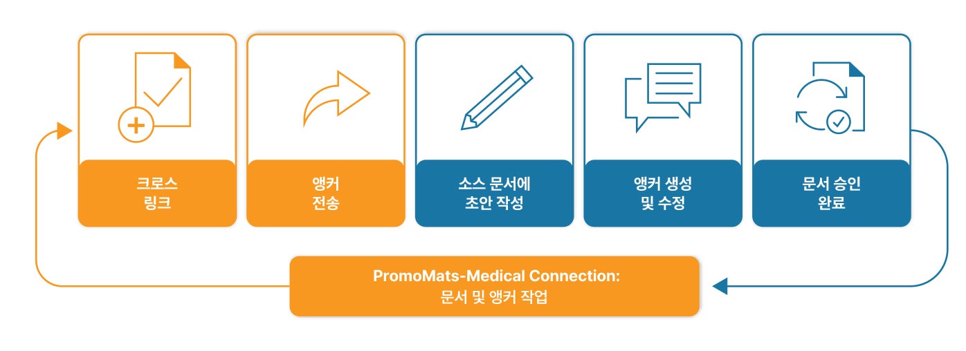 PromoMats-Medical Connection은 문서 관리를 간소화하고 메디컬 팀과 홍보 팀 간의 협업을 강화합니다. 이는 PromoMats와 Medical Vault 간의 양방향 연결을 통해 정상 상태(steady-state) 문서와 해당 앵커를 자동으로 원활하게 전송합니다.