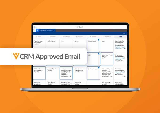 Approved Email is an application within Vault CRM that allows users to send compliant emails to HCPs in a unified experience. Users can quickly assemble an email selecting approved templates, content fragments (links in the email), and optional personalization (such as a personal greeting).