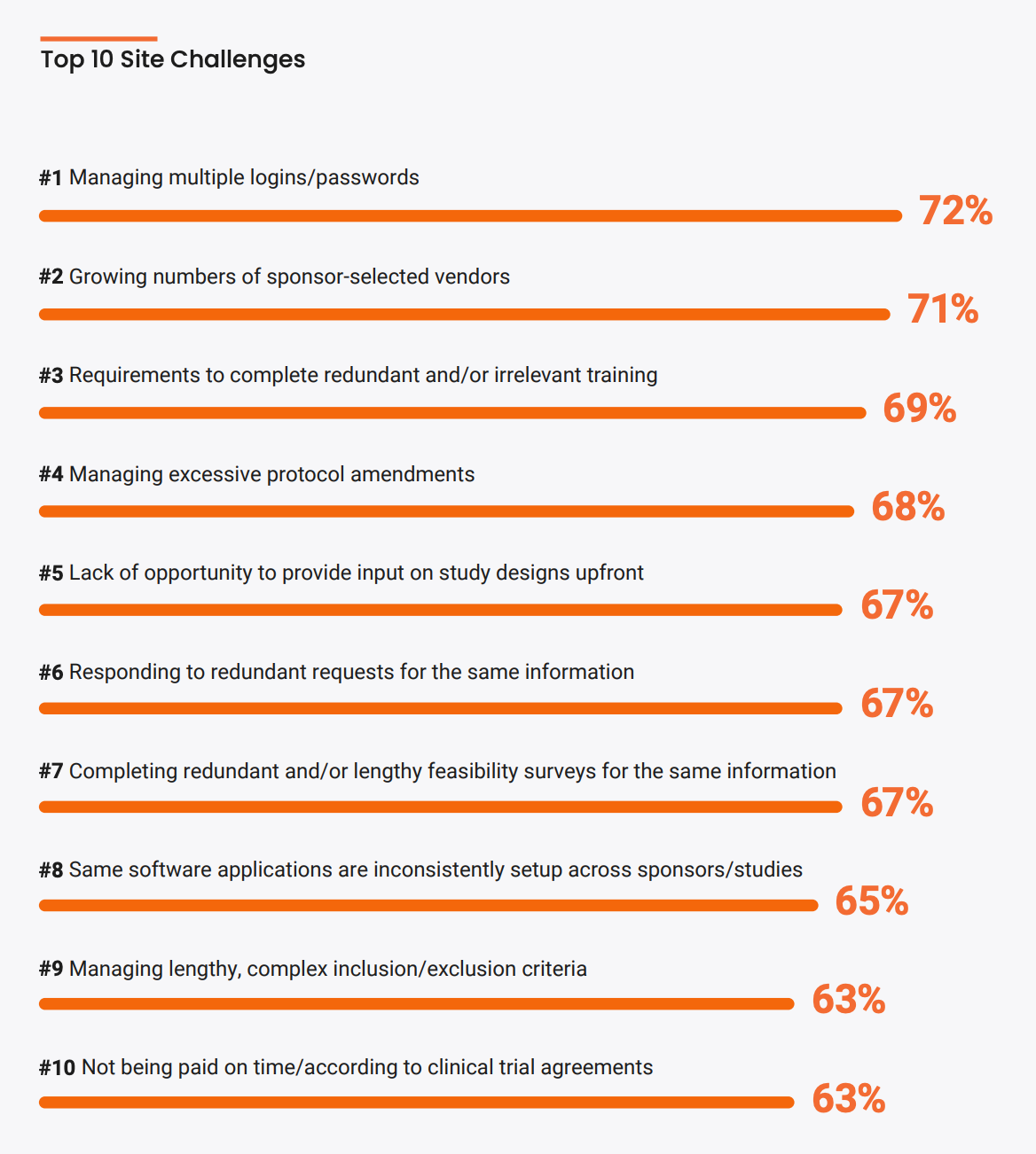 A recent survey targeting over 10,000 research site professionals found that the top two technology challenges for sites are managing multiple logins and growing numbers of sponsor-selected vendors. One site commented “We have turned down several studies that use multiple technologies – both for subjects and ourselves. It just becomes too complicated.”