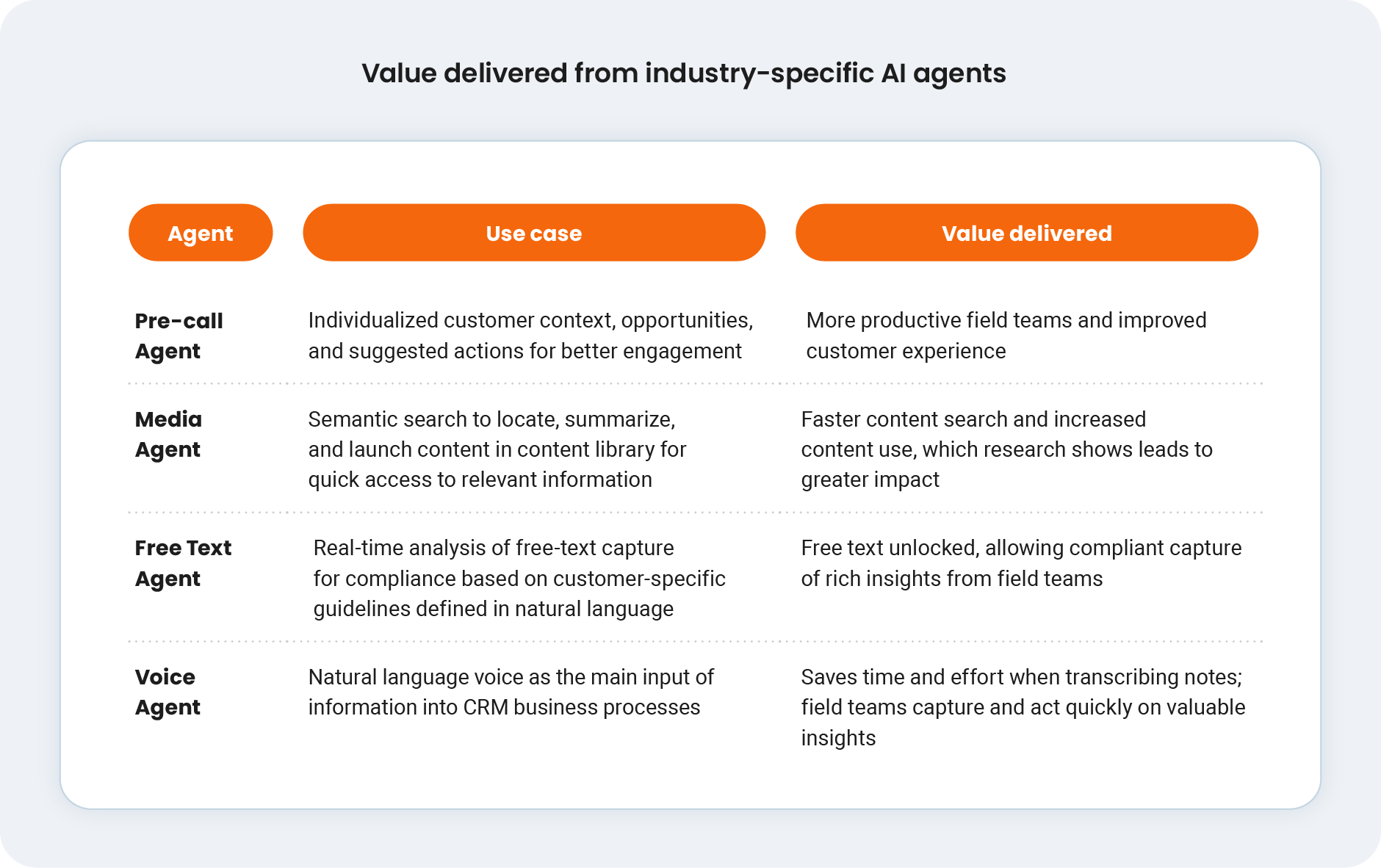 Commercial models in life sciences are changing and this will continue to accelerate over the next 10 years. Companies that embrace AI-driven engagement and decision-making will gain a clear competitive advantage. To stay ahead, your AI capabilities must evolve in step with the industry. Through industry-specific enhancements, such as specialized features for biopharma workflows or advanced analytics for medical affairs, AI built for life sciences can support your progress.