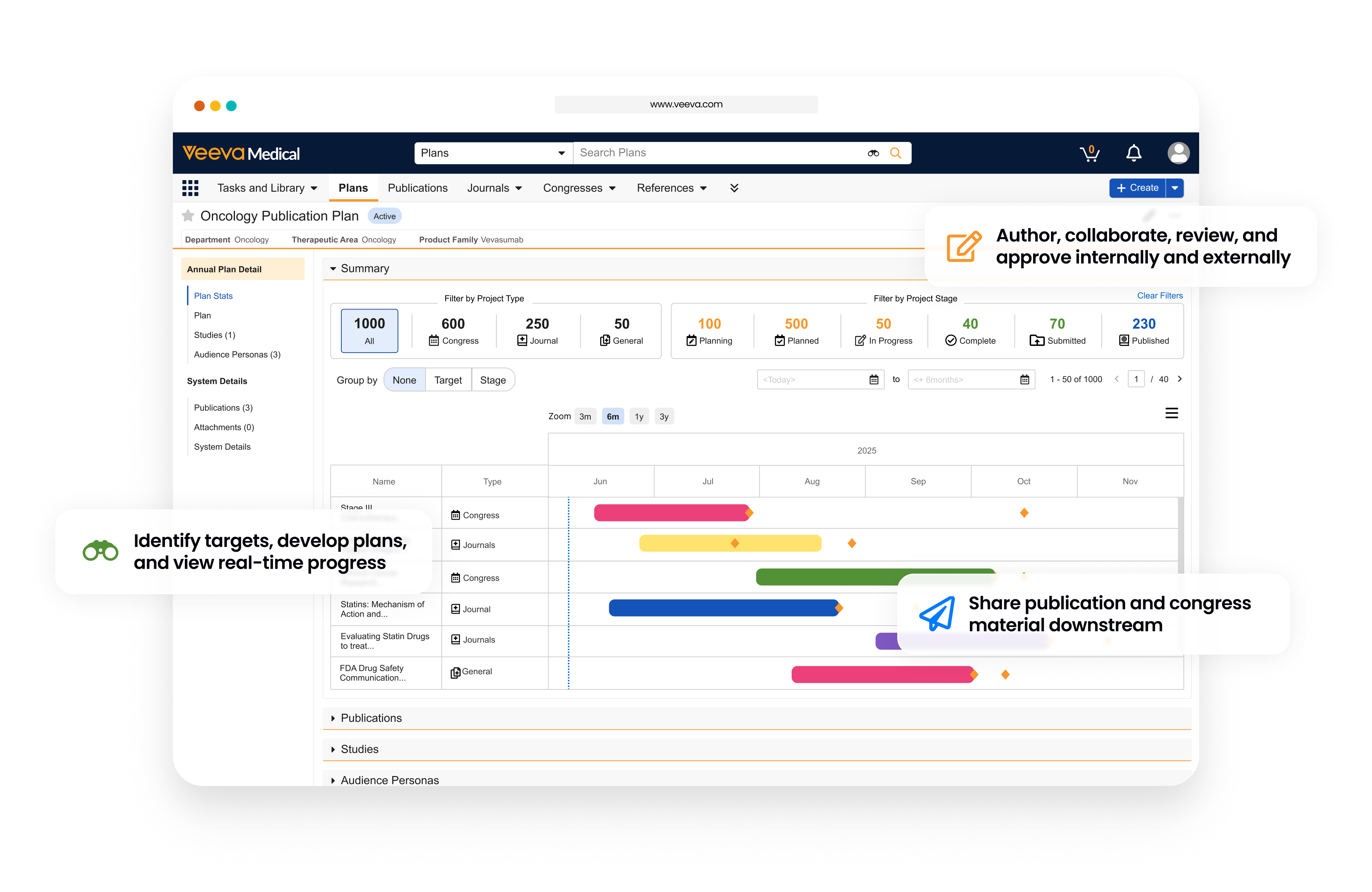• Develop plans and project portfolios by therapeutic area, publication type, and more.