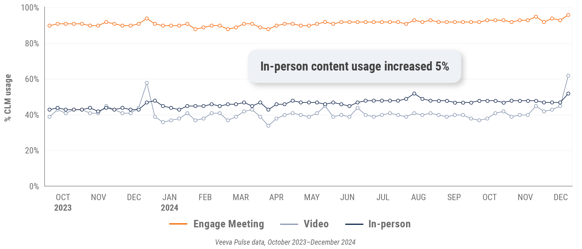 - In-person % CLM usage: Percentage of in-person engagements that leveraged content in Veeva CRM